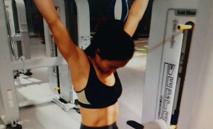 Three photos below are Yang Lan who is a member of National Women's Bodybuilding Team, she won the Champion of Bikini under 163cm at the 50th Asian Bodybuilding Championships in May, 2016, will also compete at Poland World Championships, Yang Lan was using Vertex Lat Machine , lift shoulder to train dorsi muscle, can make beautiful figure on the back.