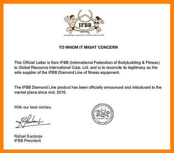 This Official Letter is from IFBB (International Federation of Bodybuilding & Fitness) to Global Resource International Crop.Ltd.and is to reconcile its legitimacy as the sole supplier or the IFBB Dimand Line of fitness equipment .